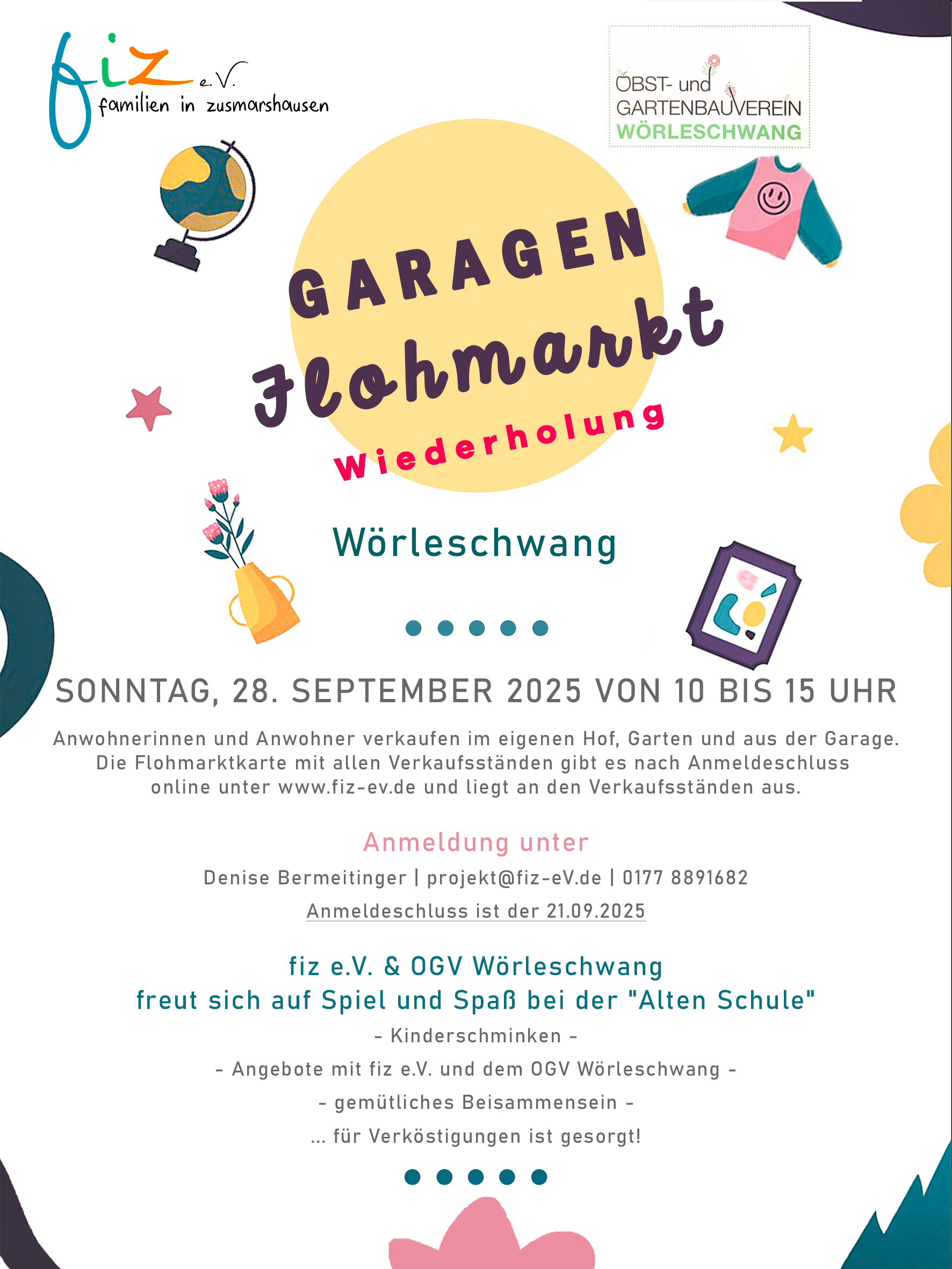 Garagenflohmarkt am Sonntag, 15. Mai 2022 von 9 bis 14 Uhr! Anwohnerinnen und Anwohner verkaufen im eigenen Hof, Garten und aus der Garage. HIER findest du alle Highlights & Aktionen zum Garagenflohmarkt und die Adressliste mit Karte aller Verkaufsständen! > PDF mit allen Infos downloaden < FiZ freut sich auf Spiel und Spaß am Apfelbaumspielplatz Kinderschminken / Angebote mit FiZ - Familien in Zusmarshausen / gemütliches Beisammensein [...]
